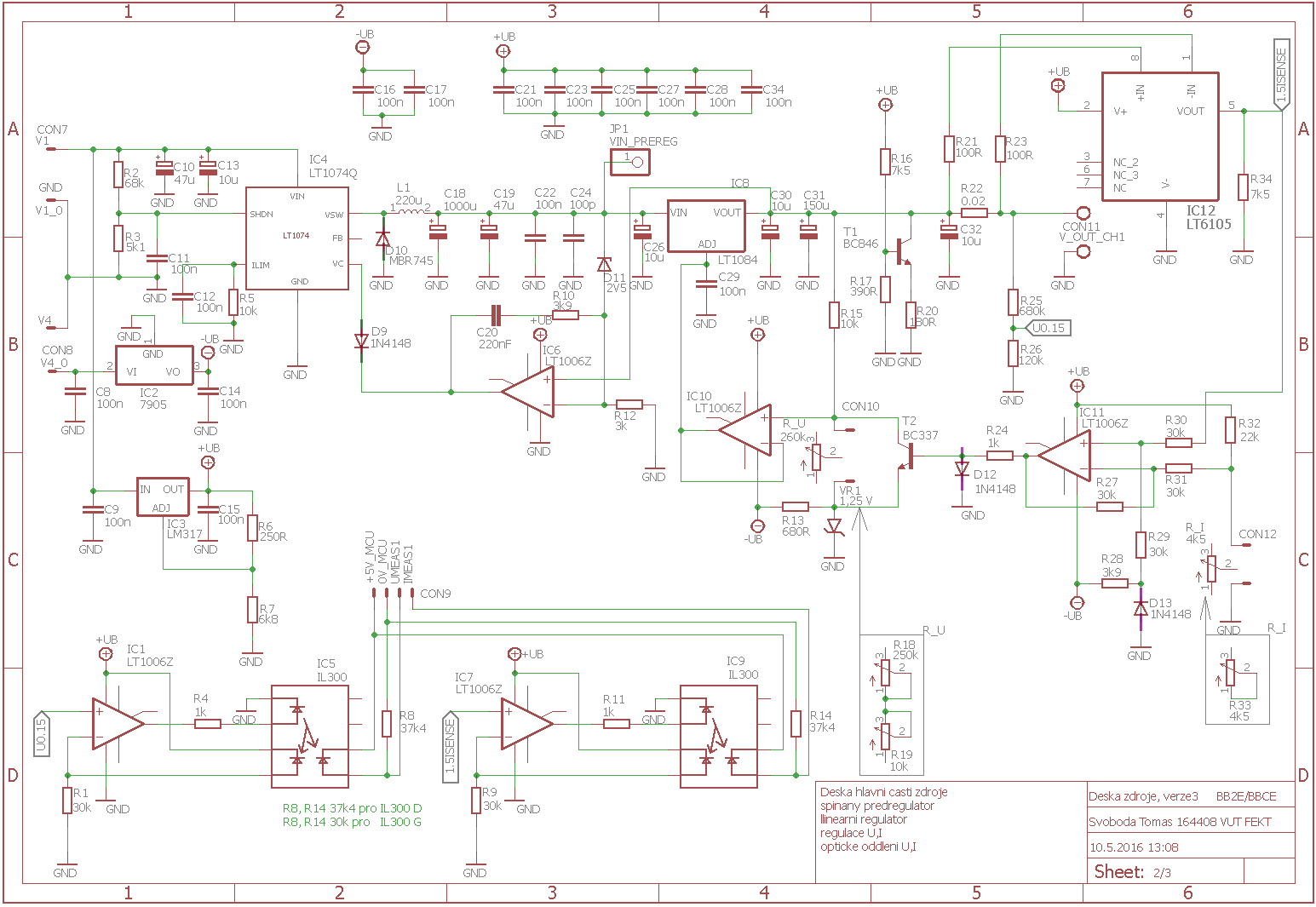 0-3A 0-30V Switching Digital Power Supply In the switching dc-dc digital power supply project with 0-30V voltage and 0-3A current adjustment, ATMEGA644 microcontroller was used in the control stage. The system is designed as dual ATMEGA644, which controls 2 power stages and displays voltage and current information on LCD screens. In the switching power supply driver power stages, LT1074 5 amp step-down dc-dc regulator integrated is used at the input, and then LT1084 5 amp adjustable dc-dc regulator integrated is used. The current is made by the LT6105 current sensing integrated circuit over a 0.02 ohm resistor, and voltage adjustments are made by the control stage with voltage divider resistors connected to the output. A toroidal transformer was used as the voltage source, 230v primary input and secondary outputs are 32V AC 3.2A 7V AC 0.1A 7V AC 0.3A. 0-3A 0-30V Power Supply MCU Power Solid Circuit Diagrams Design of the linear part of the power supply The linear stabilizer is based on the application of a classic three-terminal stabilizer. It can be used, because the power loss on it will be about 7 W in the worst case. The linear stabilizer used is LT1084, it is similar to the well-known LM317, but compared to it it has improved parameters and is designed for a higher current without the need for a booster transistor. The design is based on a basic circuit with an output resistive divider and a supply voltage of one polarity. In this connection, it is not possible to achieve a value of output voltage lower than 1.25 V, which is the value of its internal voltage reference. For more details see figure 3 below