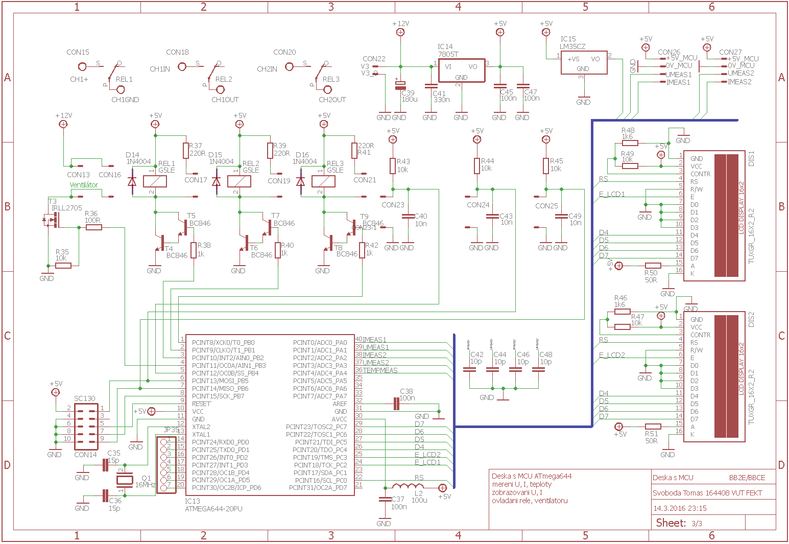 Microcontroller The microcontroller used is ATmega644, which will be used to measure voltage, current, display these values on the LCD, control the relay for connecting the output terminals and switch on the fan when the measured temperature is exceeded by an analog temperature sensor. The microcontroller can be programmed via the SPI bus in an already finished device, which is used here by the Atmel Ice programmer. Microcontroller Wiring The basic connection with the microcontroller is shown in Figure 10. The circuit is powered by a 5V 7805 stabilizer (not drawn). The CON14 connector is used to connect to the ISP programmer. The crystal is selected with a frequency of 16 MHz together with the recommended capacitor value according to. Pins 31-32 are used to connect an external reference voltage, since this option is not used, it is recommended to ground the AREF input through a capacitor. The L2 and C37 components form a simple low-pass filter. Power through this filter is required to power the analog part of the microcontroller. The components were selected according to [24]. Pins 1-7 are connected by buttons and transistors for switching relays (not drawn for simplicity). Pins 40-36 are used to measure voltage, current and temperature. Pins 25-29 are used to connect an LCD display that uses 4-bit communication. Capacitors C42, C44, C46, C48 help to reduce interference at the input of the A/D converter.