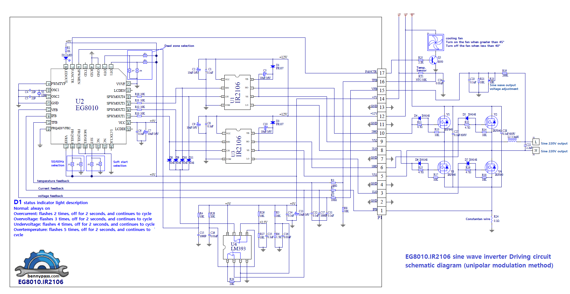 This is the latest generation inverter thanks to the digital chip EG8010, they function very well by bringing their own dead-time control of pure sine wave inverter generator chip, used in two-stage DC-DC-AC power conversion structure or single-stage DC-AC power frequency transformer Boost architecture, an external 12MHz crystal oscillator, to achieve high precision, and harmonic distortion is very small, 50Hz or 60Hz pure sine wave inverter ASIC. The chip uses CMOS technology, the internal integration of the SPWM sine generator, dead time control circuit, the multiplier factor range, soft start circuit, protection circuit, RS232 serial communication interface and a serial LCD driver module 1602 functions. Depending on requirements, this circuit can be built with 300, 900, or 2500 watts