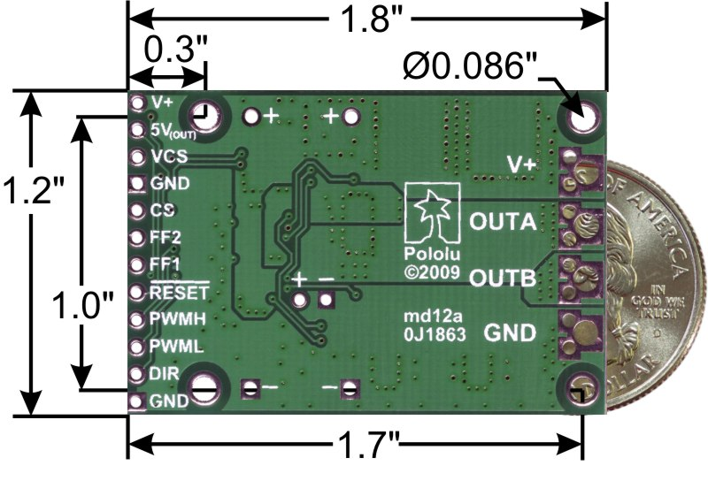 The versatility of this driver makes it suitable for a large range of currents and voltages: it can deliver up to 23 A of continuous current with a board size of only 1.8" by 1.2" and no required heat sink. With the addition of a heat sink, it can drive a motor with up to about 37 A of continuous current. The module offers a simple interface that requires as few as two I/O lines while allowing for both sign-magnitude and locked-antiphase operation, and an optional third control input unique to this board allows for coasting. This board also features a current-sensing circuit that measures bidirectional motor current with a magnitude up to 30 A and outputs an analog voltage.