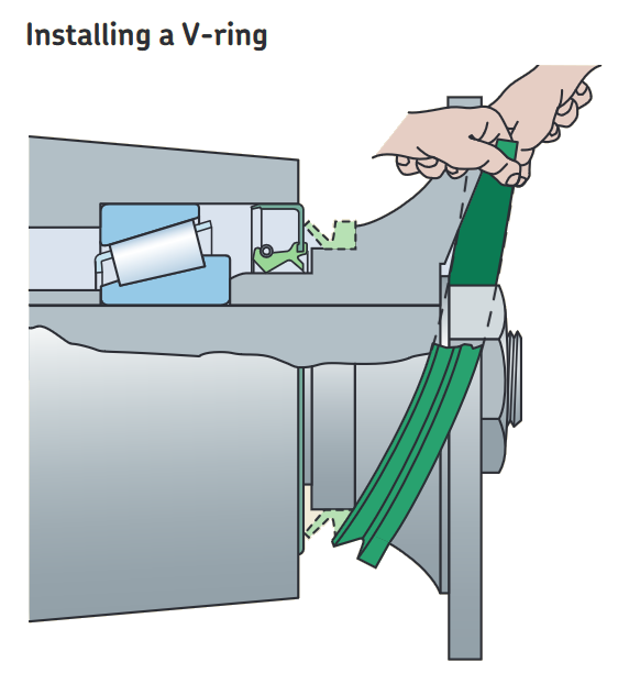 A V-ring comprises a seal body, a flexible conical-shaped sealing lip, and an integral, resilient “hinge”. Once stretched, it is directly installed on the shaft, where the inherent tension of the seal body holds it in place. This allows it to rotate with the shaft, creating an axial seal against a stationary counterface.