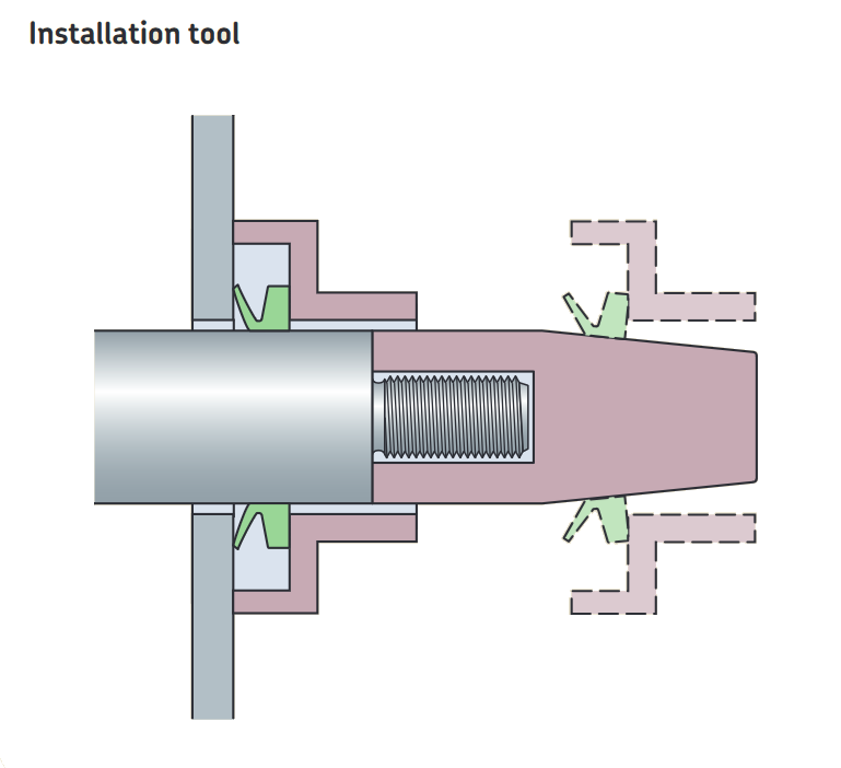 V-rings are elastic and can be stretched and pushed over other components, which facilitates the installation (fig. 5). When several V-rings are to be installed, a simple tool († fig. 6) can be used to push the seals to their position at a predetermined distance from the counterface. V-rings can also be cut and rejoined in the field. The general installation guidelines include the following: