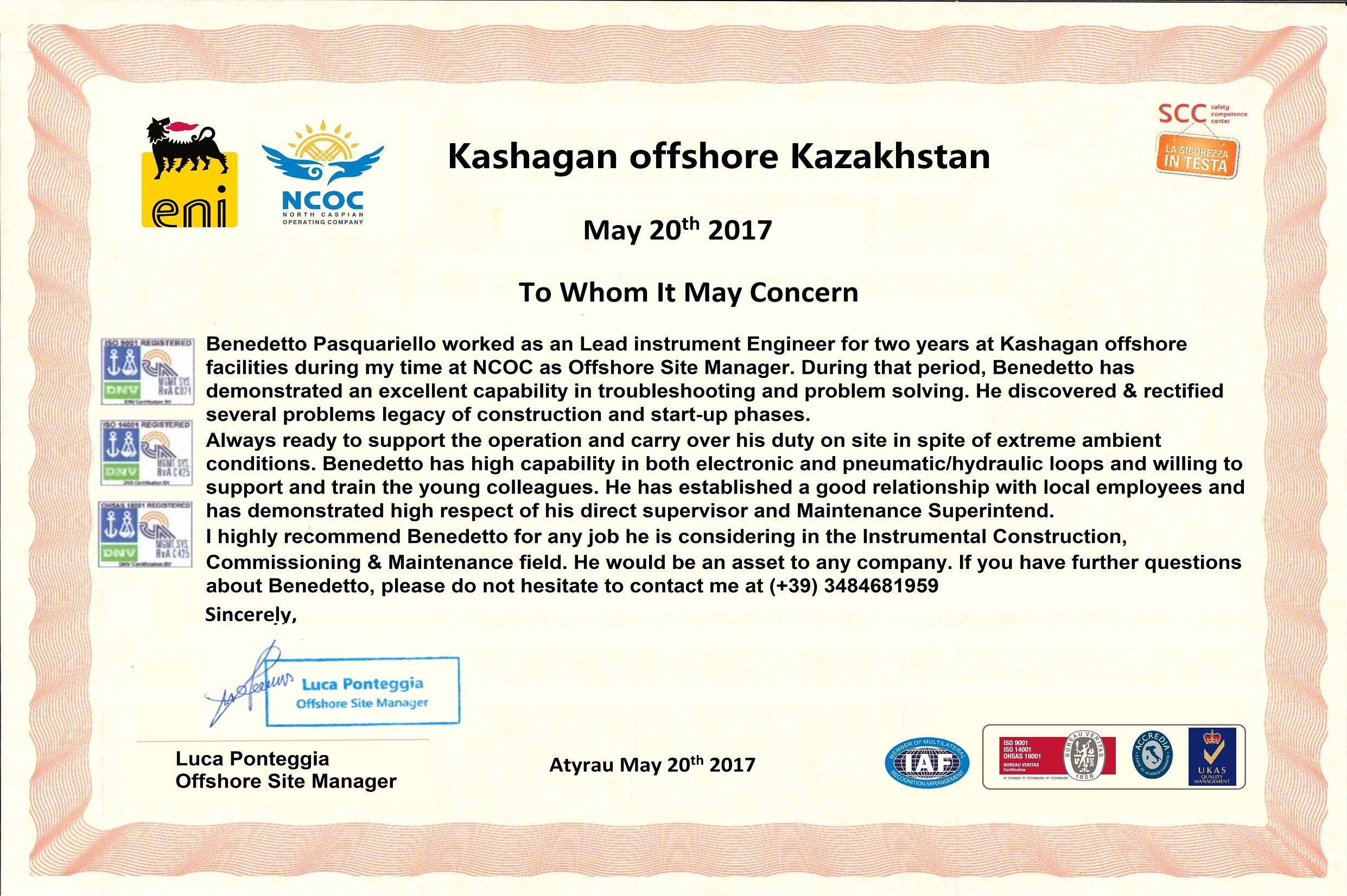 Recognition letter from Site Manager